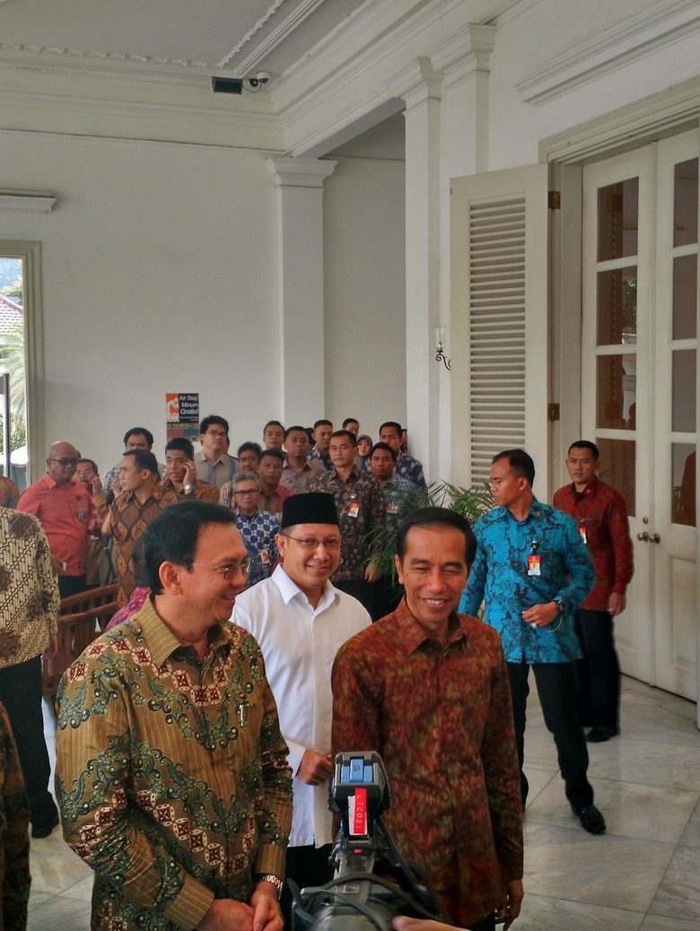 Ahok, Lukman, Teddy, Tito, dan Prasetyo sebenarnya sudah menunggu sekitar 15 menit di depan teras Balai Kota, berdiri sambil berbincang. Begitu Jokowi turun, dia langsung disambut dengan salaman dan senyuman.