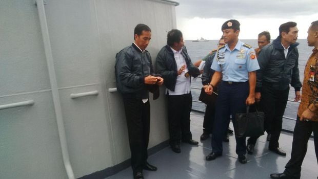 Jokowi yang berkemeja putih, diberikan jaket dan topi dari KRI Imam Bonjol. Namun topi itu batal dikenakan karena angin yang kencang di luar kapal, cuaca juga cukup mendung. Jokowi lalu berjalan ke bagian depan kapal didampingi Menko Polhukam Luhut Pandjaitan.