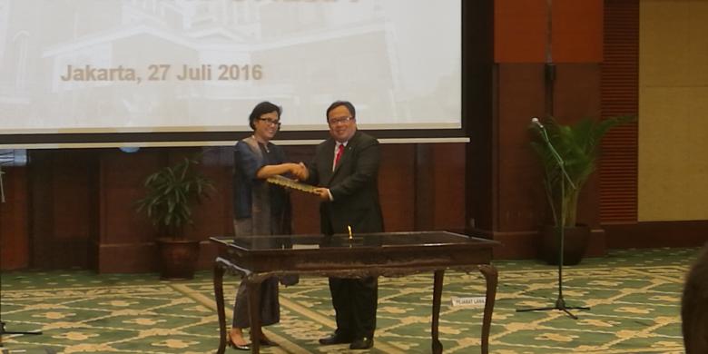 Menteri Keuangan Sri Mulyani Bersama Bambang Brodjonegoro dalam acara serah terima jabatan di Kantor Kemenkeu, Jakarta, Rabu (27/7/2016)