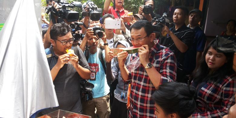 Calon gubernur nomor urut dua, Basuki Tjahaja Purnama alias Ahok saat menyantap sepotong semangka saat kunjungan kampanye permukiman warga yang yang ada di Gang Haji Ami dan Haji Umat, di Kelapa Tiga, Jagakarsa, Jakarta Selatan, Senin (31/10/2016). Pada kesempatan itu, ia bahkan sempat memborong satu gerobak buah milik pedagang rujak itu.
